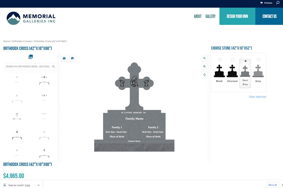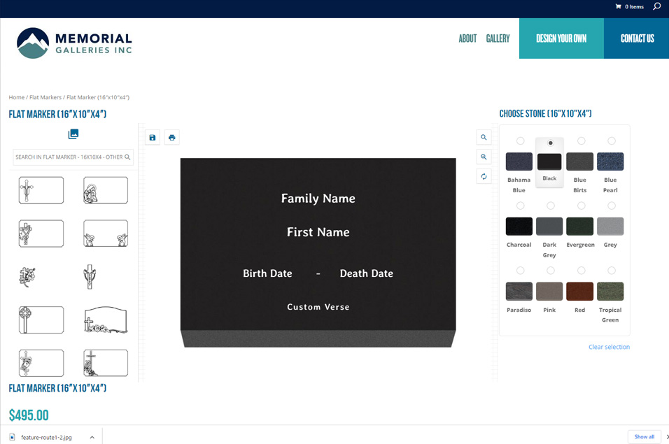 This website is a CMS that has a shopping cart but it also contains a tool that enables users to customize their own tombstone. Users can choose their style of memorial stone and they can customize the names, sayings and carvings right on the website. They can then make the purchase and set up the shipping details.